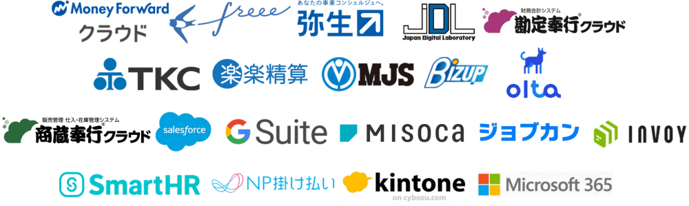 弥生会計、マネーフォワードクラウド、freee、JDL、会計王、勘定奉行など、 各種会計ソフトに対応致します。